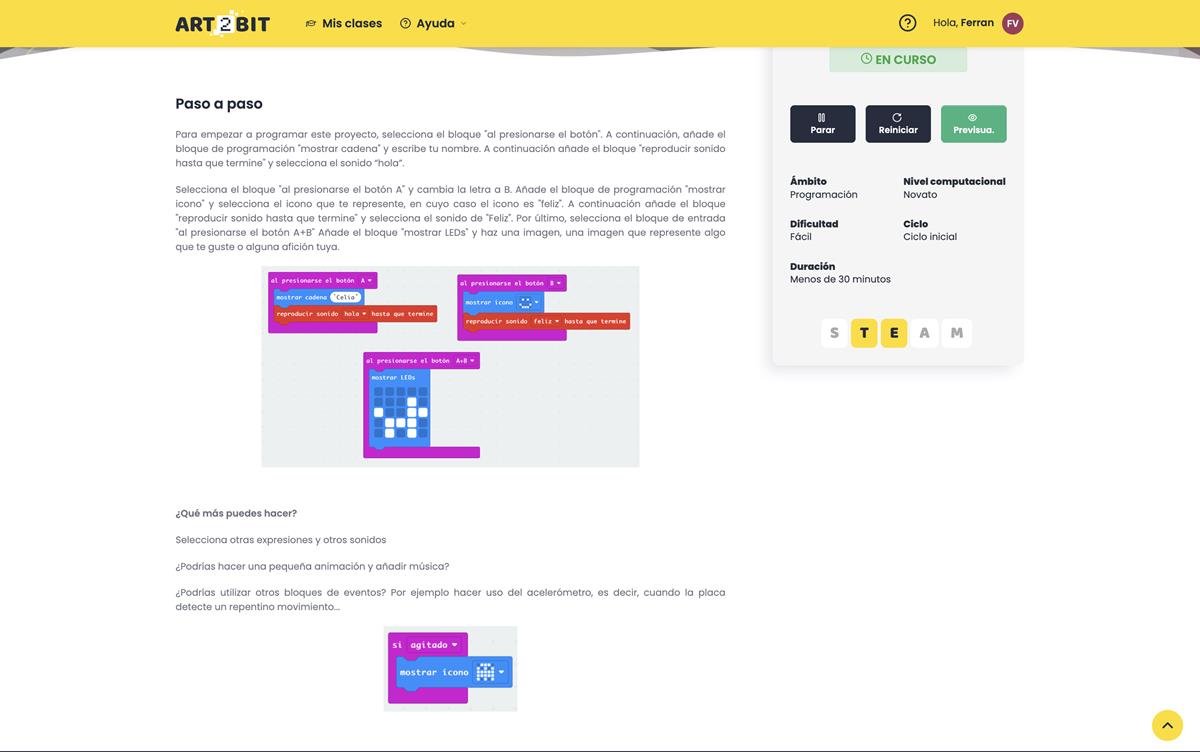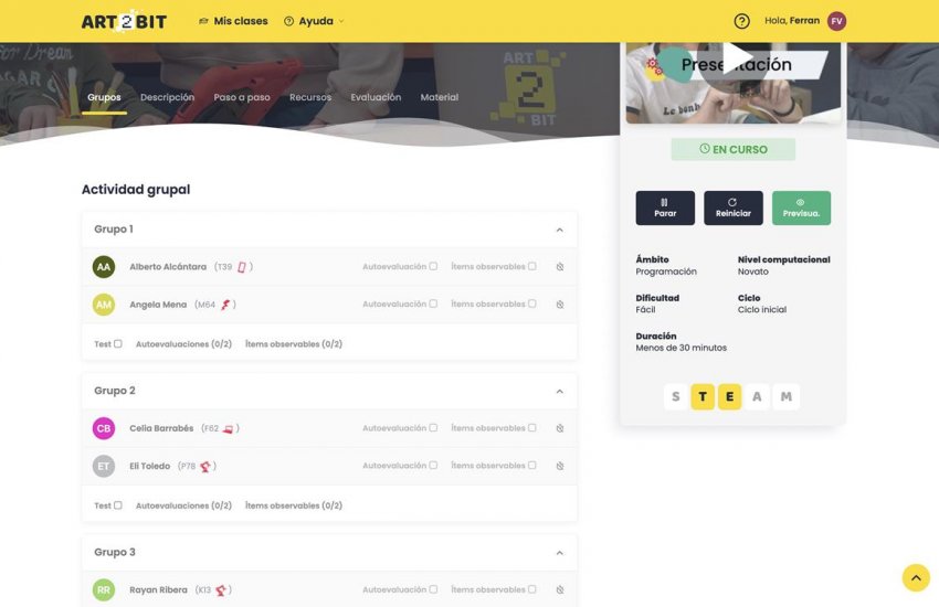 "ART2BIT es sencillo de usar para cualquier docente, las actividades guiadas y los videos nos han facilitado el trabajo en el aula."